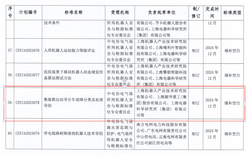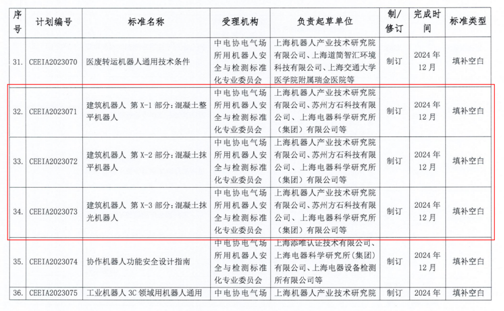 2023年9月27日,中中电协[2023]168号《关于下达2023年第三批中电协团体标准制定计划的通知》,下达了中电协团标《建筑机器人 第X-1部分:混凝土整平机器人》、《建筑机器人 第X-2部分:混凝土抹平机器人》、《建筑机器人 第X-3部分:混凝土抹光机器人》、《集装箱自动导引车故障分类及处理导则》(发文序号32-34、39)四项标准制修订计划。