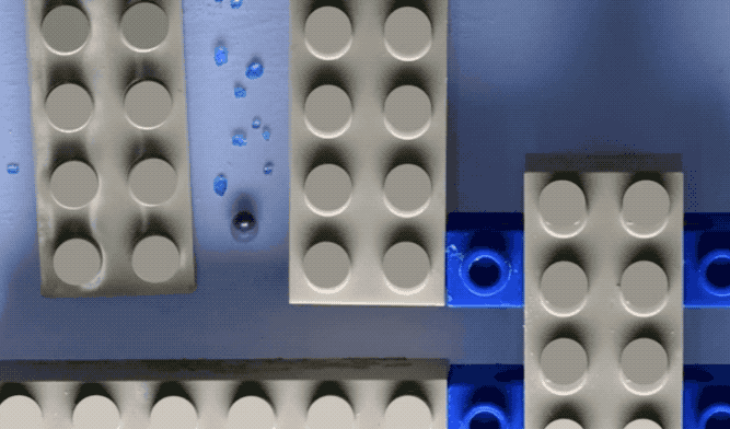 Hydrobot 可以作为一个清洁机器人来吸附超疏水表面狭窄角落的灰尘。在概念实验中,研究人员用硫酸铜(CuSO4)模拟灰尘,将其放置在由积木构成的封闭狭窄的超疏水表面上。