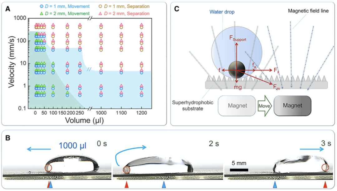 SIB 和水之间的高粘附力,可以提供足够的性能来保持水滴高速运动,研究人员在 4 个数量级的速度范围内测试了水滴特定的可操纵。理论上,这样的磁驱动操纵策略的速度可以慢到 0 毫米 / 秒,中速可实现 6.3mm/s 的液滴操纵,在更快的情况下,研究人员在 0.01 秒内完成 2 厘米的移动,平均速度为 2000 毫米 / 秒。在论文中,研究人员表示,这还并不是能达到的最高速度。