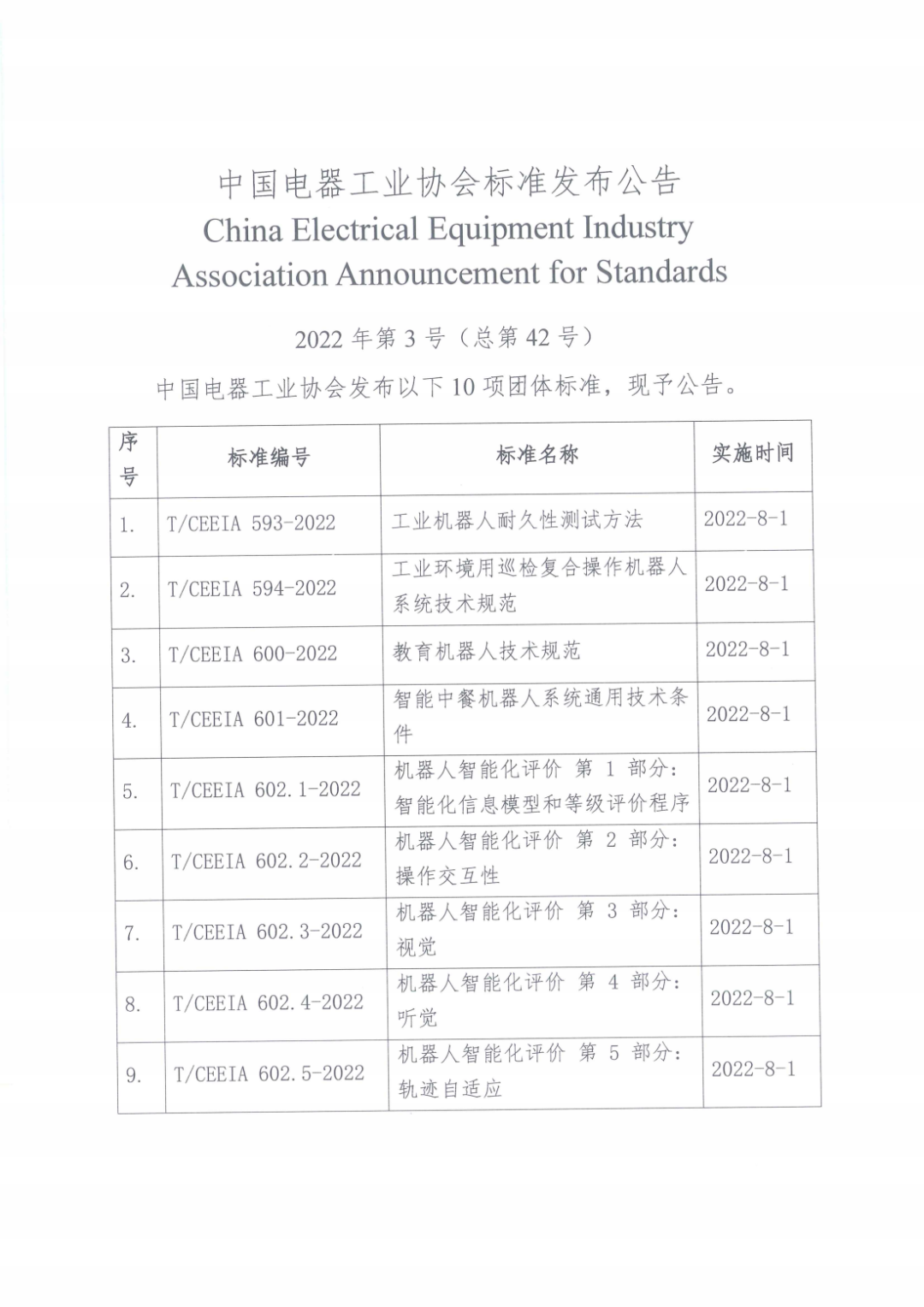 2022年7月,由中电协电气场所用机器人安全与检测标准化专业委员会归口《工业机器人耐久性测试方法》等10项团体标准正式发布,涉及领域均为机器人。