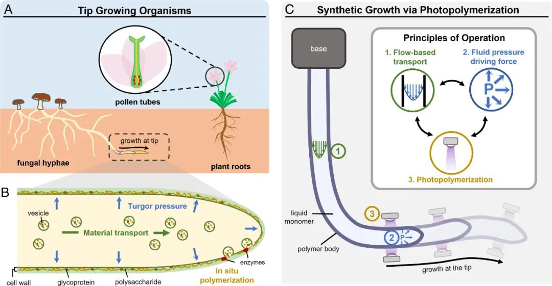 科研团队在经过充分研究的真菌菌丝、根尖和花粉管的案例中,发现植物尖端生长时,使用水来运输转化为坚实根的构建块,该机制有三个原理: