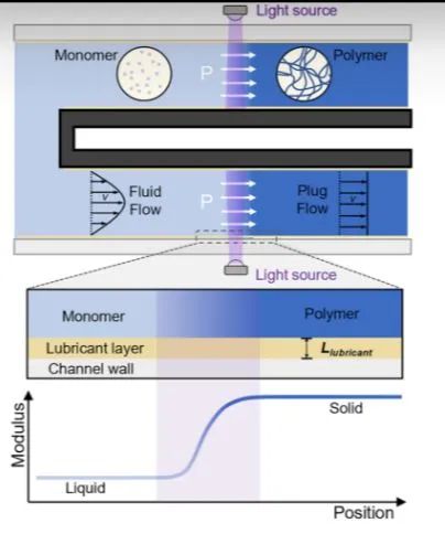 随后,团队又想出一个办法,在单体溶液中加入PDMS-PEO润滑剂,这是一种嵌段共聚物,含有约 65% 的聚(环氧乙烷)含量,它具有在通道壁上的选择性吸附能力,在材料的“生长”过程中可以自发形成润滑层,并在挤出过程中不断补充。研发人员将开发的制造方法称为「自润滑界面光聚合(E-SLIP)」挤出。