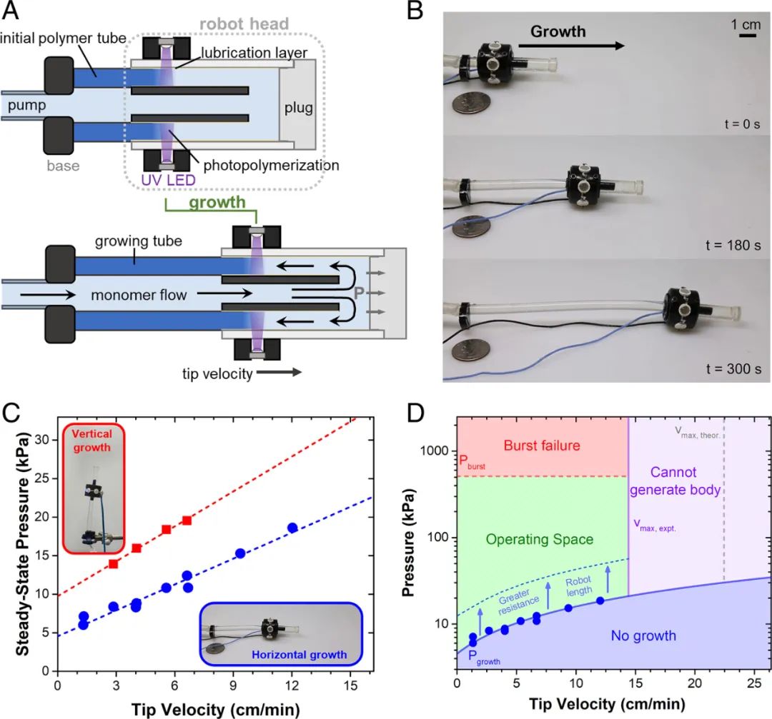 机器人的延伸是用一小段聚合物管(~5 cm)开始的,将单体溶液输送到机器人头部的起始通道,流体压力推动机器人头部向前,使机器人智能化身体能够连续“生长”。