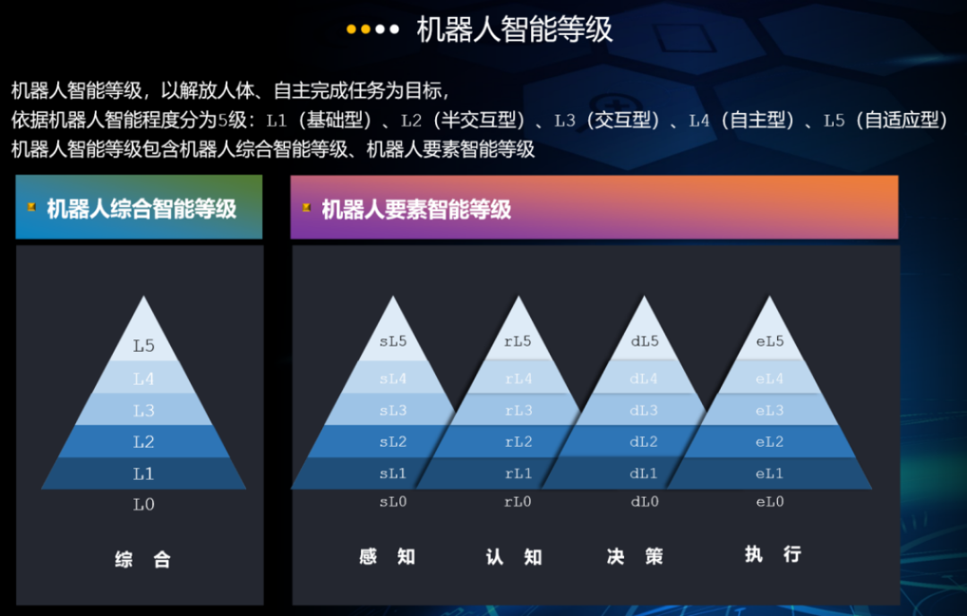 机器人智能等级,以解放人体、自主完成任务为目标,基于感知、认知、决策、执行四大智能要素实现的基础上进行划分,包含机器人综合智能等级、机器人要素智能等级。