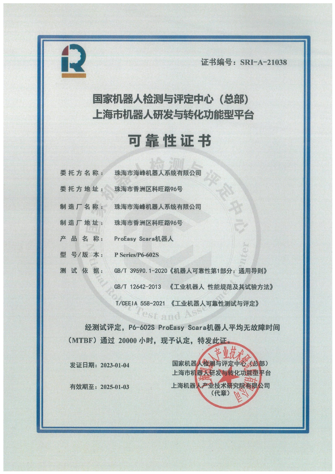 1月3日,珠海市海峰机器人系统有限公司的ProEasy 机器人P6-602s SCARA机器人顺利通过kaiyun开云(中国)机器人有限公司官网的MTBF 20000小时测评。